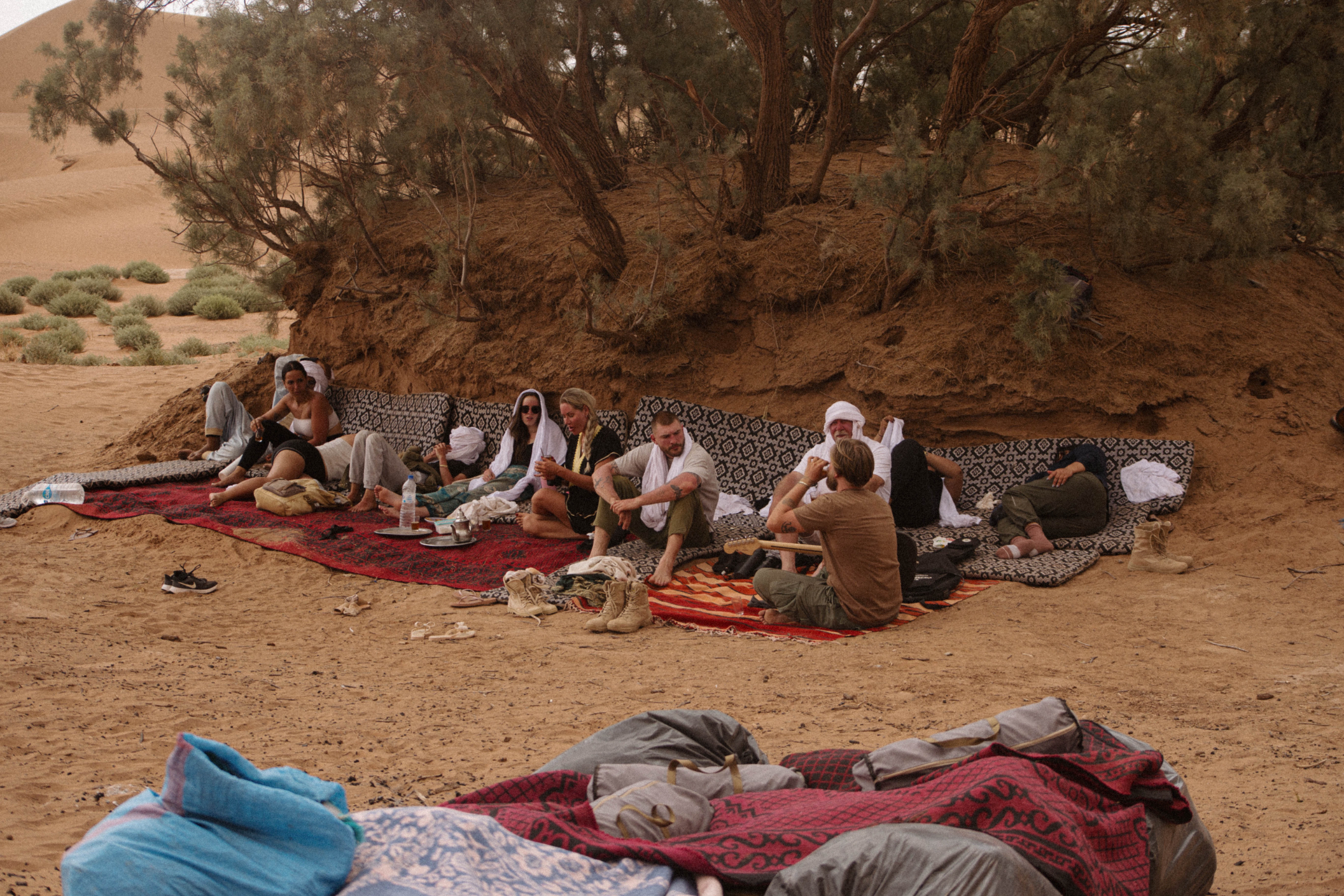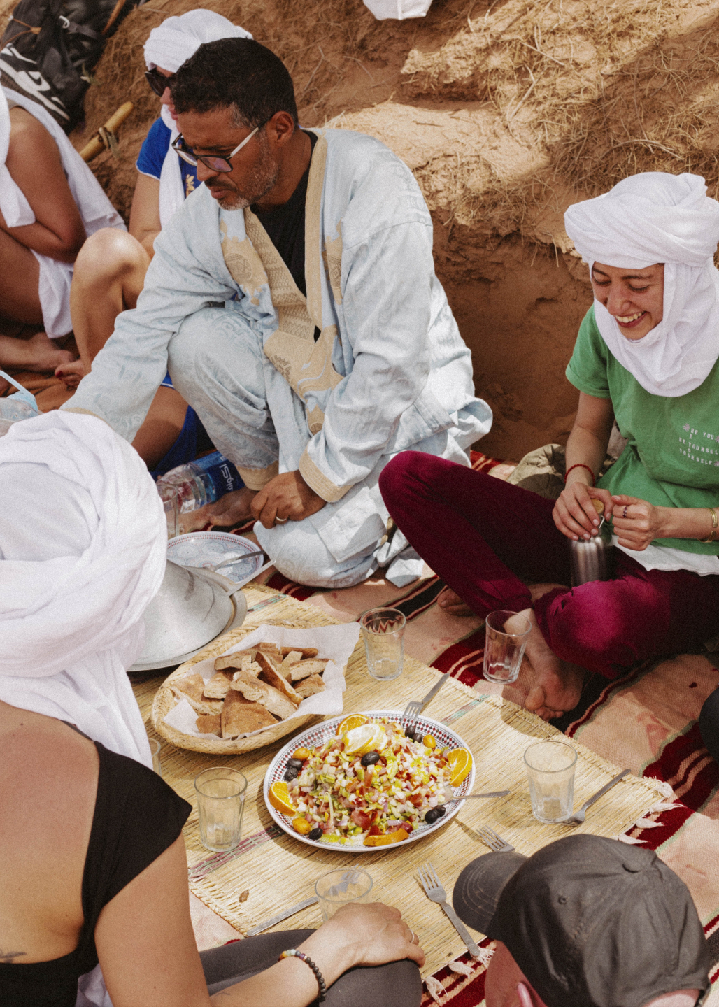 We will be guided by nomadic Amazigh people who have lived with the rhythms of the desert for generations. Their way is simple, embodied, and deeply wise. They are shaped by the wind, the stars, and the silence between every little things. As we walk together, you’ll witness the beauty of traditional nomadic life like meals cooked slowly over fire, bread buried in the coals, stories passed between sips of tea, songs that rise from the body like memory.